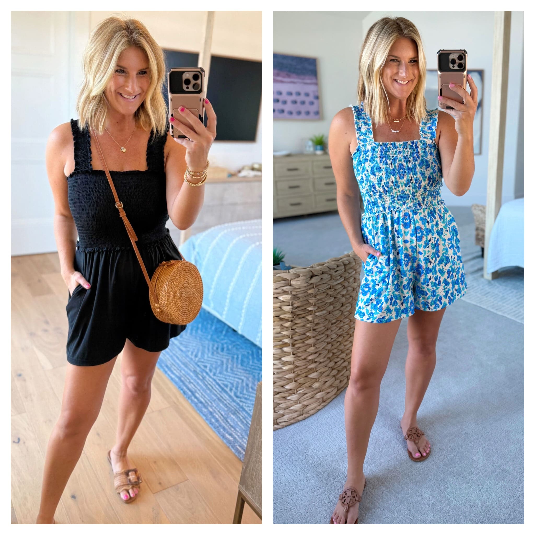 Amazon-Strampler (entspricht der Größe, trägt Größe M) // Rattan-Umhängetasche // Sam Edelman Sandalen (getreu der Größe)