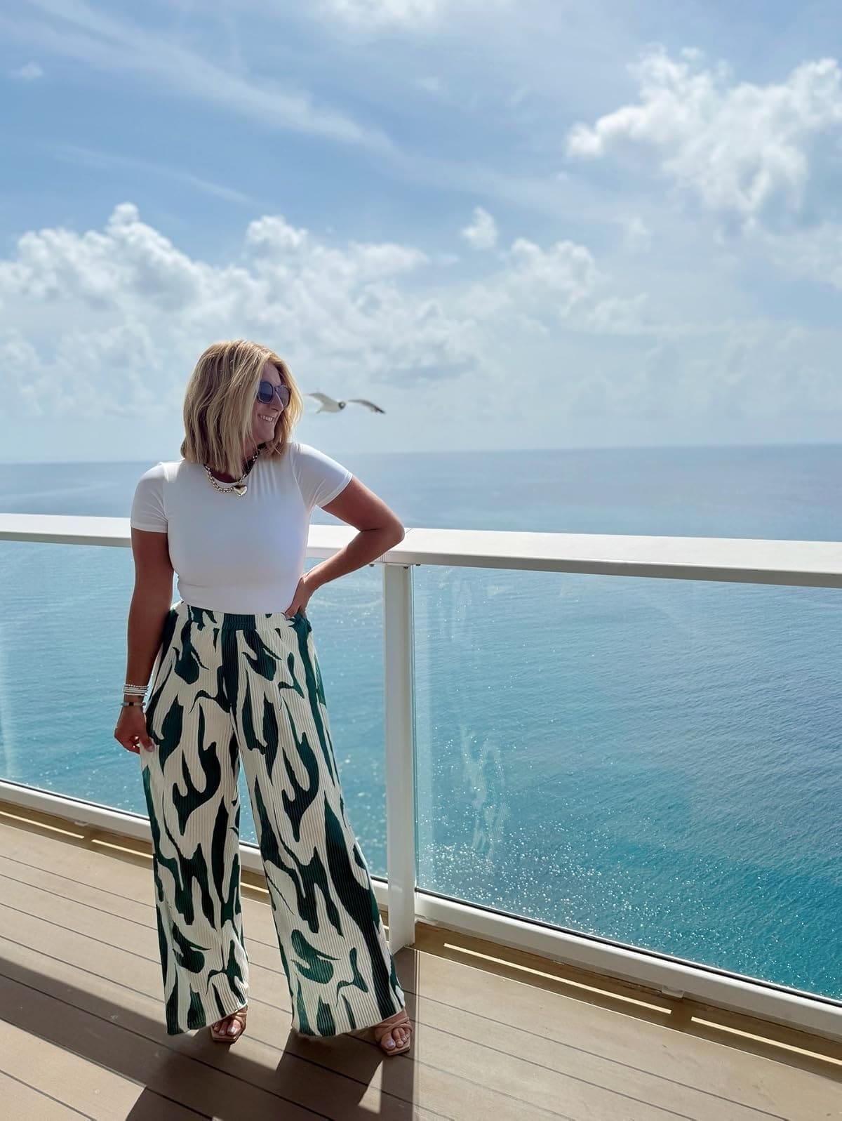Hose (entspricht der Größe, trägt die Farbe Medium in Dunkelgrün und Beige) // Ähnliches Prime // Ähnliche Absätze // Sonnenbrille