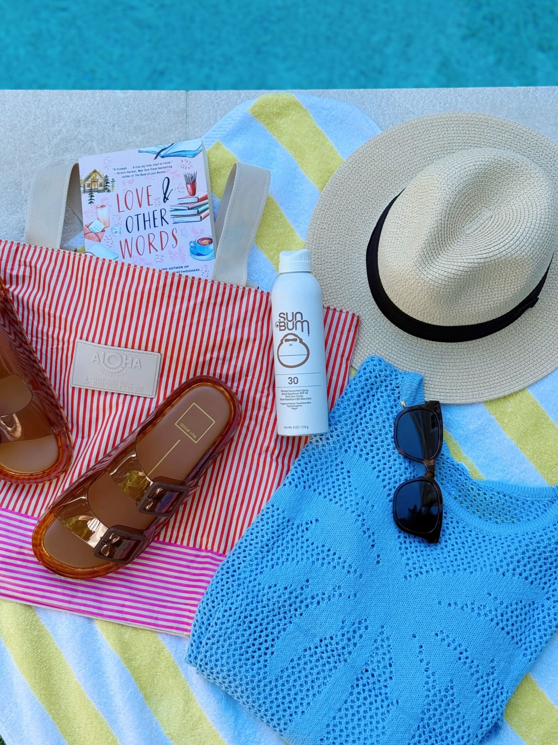 Handtuch // Sandalen (entspricht der Größe) // Blaues Häkel-Coverup-Prime (entspricht der Größe) // Sonnenschutz // Strandhut // Strandtasche // Buch // Sonnenbrille