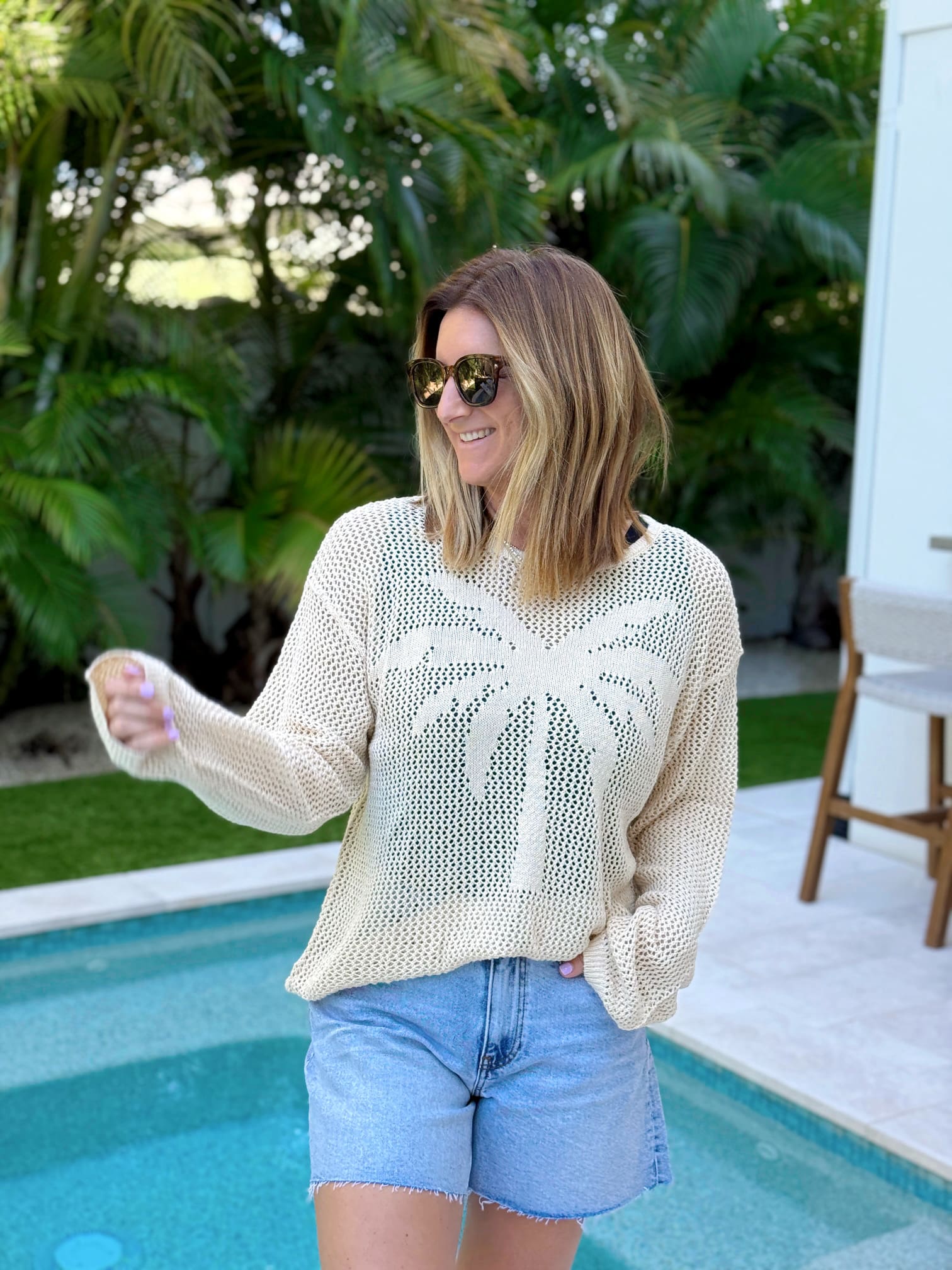 Gehäkeltes Coverup-Prime (entspricht der Größe, trägt Größe M) // Ähnliche Jeansshorts (entspricht der Größe) // Sonnenbrille
