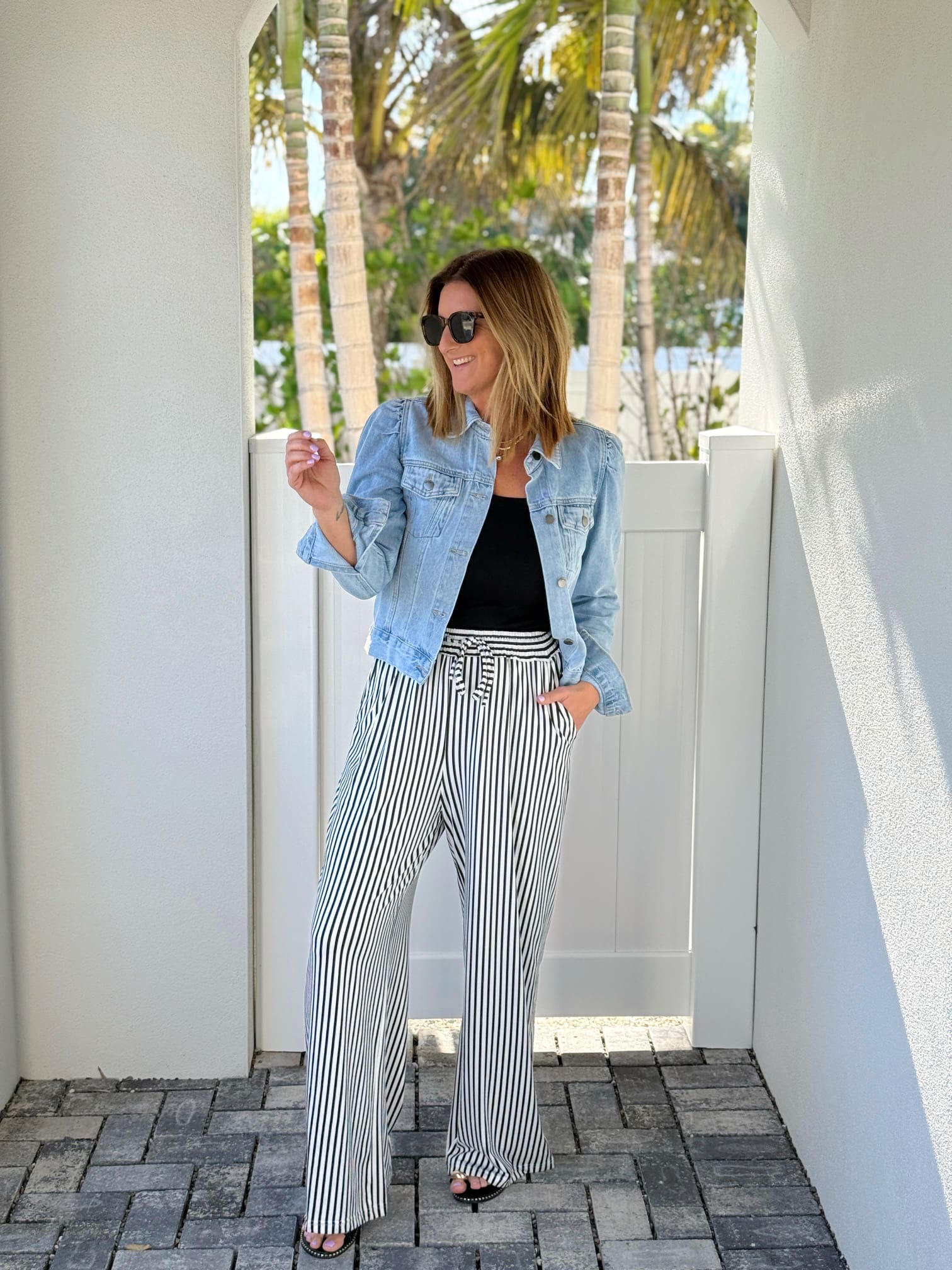 Amazon-Hosen (entspricht der Größe, trägt Größe M) // Tanktop (entspricht der Größe, trägt Größe M) // Jeansjacke // Ähnliche Jacke von Amazon // Sandalen // Sonnenbrille